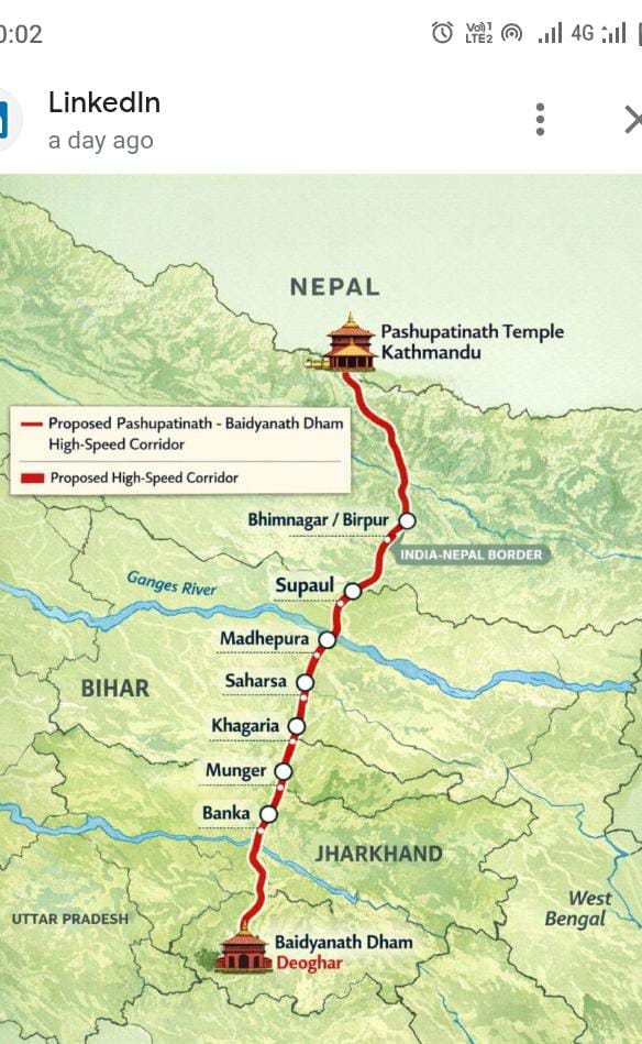 काठमाडौं । भारत सरकारले नेपालको राजधानी काठमाडौं र झारखण्डको देवघर जोड्ने हाई–स्पिड सडक करिडोर निर्माणको प्रस्ताव स्वीकृत गरेको समाचार सार्वजनिक भएको छ। धार्मिक पर्यटन प्रवर्द्धन तथा आवागमन सहज बनाउने उद्देश्यसहित अघि बढाइएको उक्त परियोजनालाई “पशुपतिनाथ–वैद्यनाथ हाई–स्पिड करिडोर” नाम दिइएको छ।
